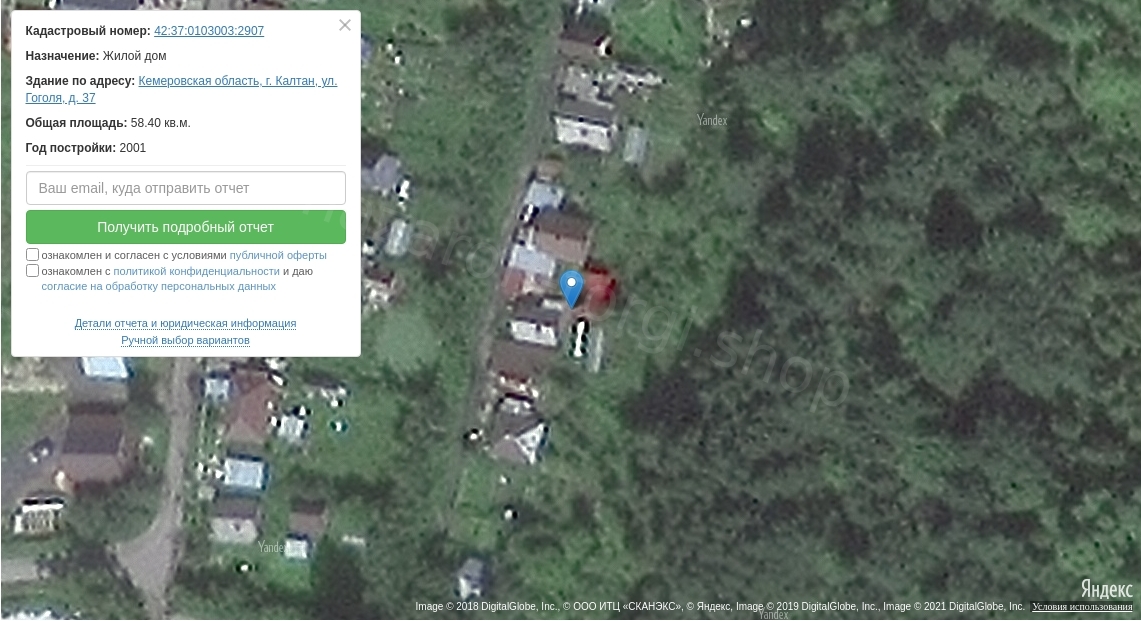 Жилой дом, назначение: жилое, площадью 58,4 кв. м, количество этажей 2, в том числе подземных 0, с кадастровым номером: 42:37:0103003:2907.