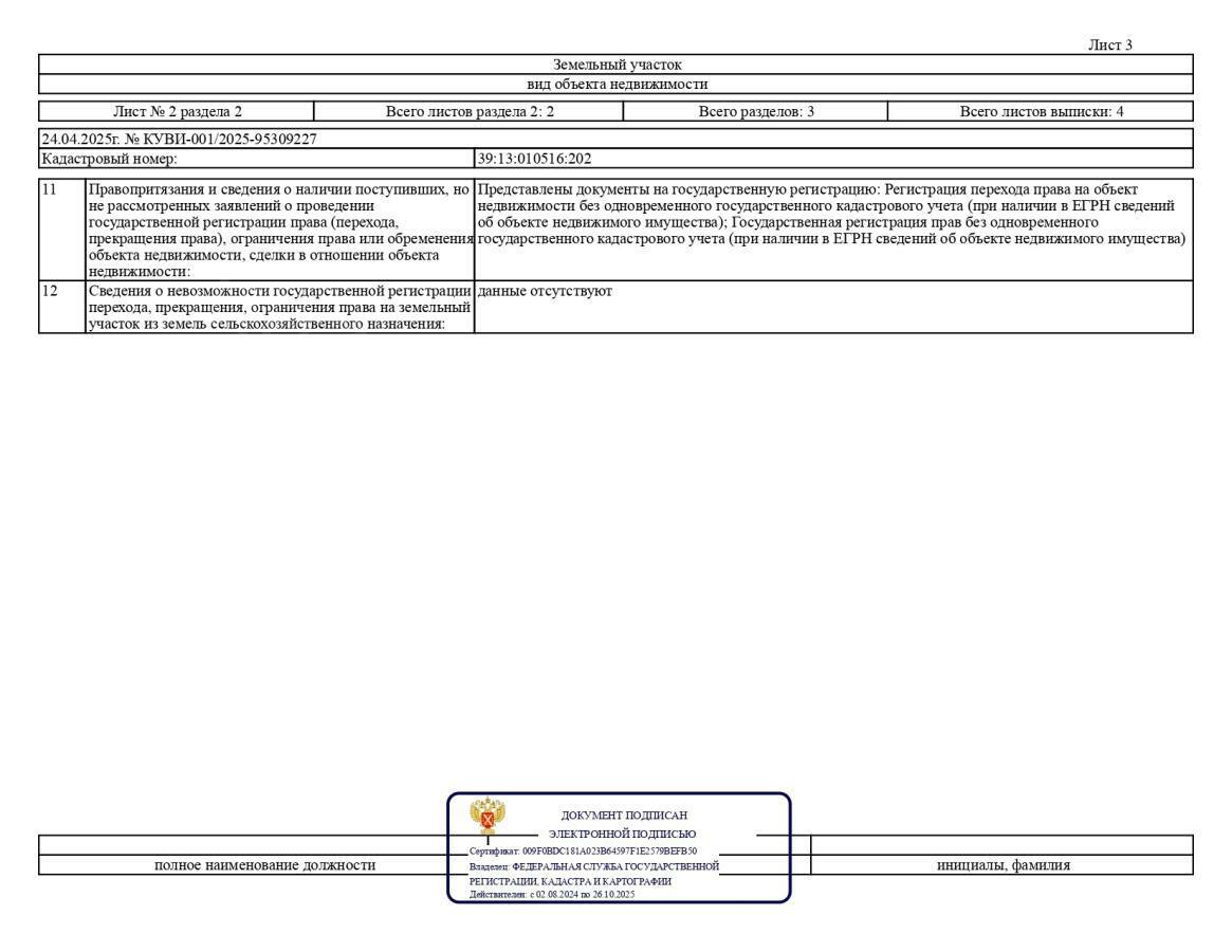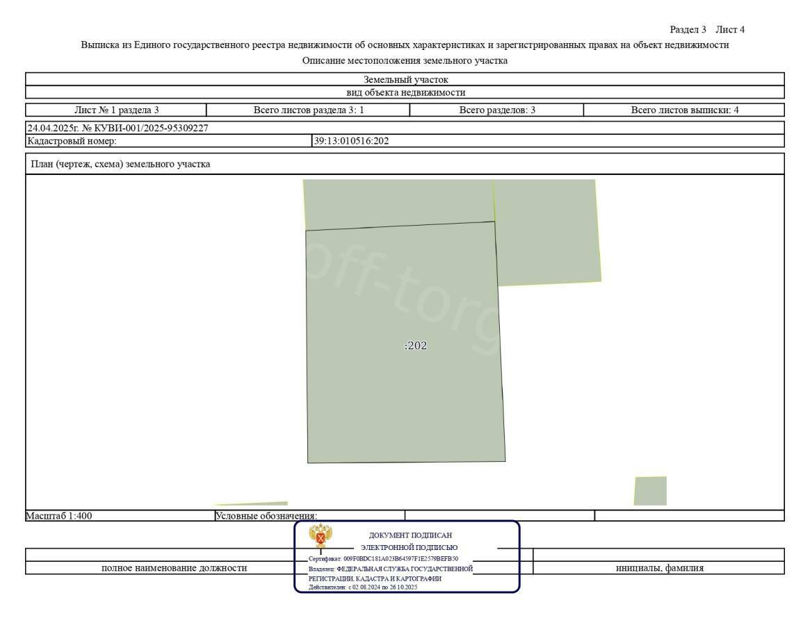 Продается земельный участок для садоводства (900 кв.м) Кадастровый номер: 39:13:010516:202 Площадь: 900 кв.м Разрешенное использование: Для ведения садоводства Описание участка: Участок ровный, квадратной формы, подходит для разведения сада или огорода. Хорошая транспортная доступность, рядом дороги общего пользования. Возможность строительства садового дома Рядом коммуникации (электричество, возможен подвод воды). Преимущества: ✅ Отличное место для отдыха и выращивания плодовых культур. ✅ Чистый воздух, спокойная экологичная зона. ✅ Удобное расположение в черте города . - Проведение открытого аукциона в электронной форме на право заключения договора купли-продажи Земельного участка Калининградская область